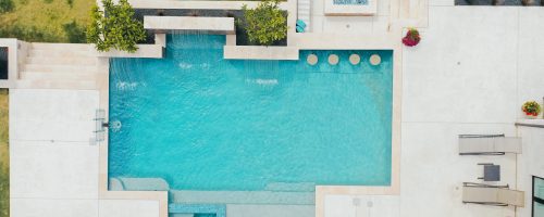 - Features: Aqua Blue PebbleSheen • Basketball Hoop • Bubblers • Flush Spa • Grey Ice Heavy Stone Texture • In-Pool Bar Stools • Ivory Travertine • Linear Fire Pit • Sheer Descent Rain Walls • Tanning Ledge •