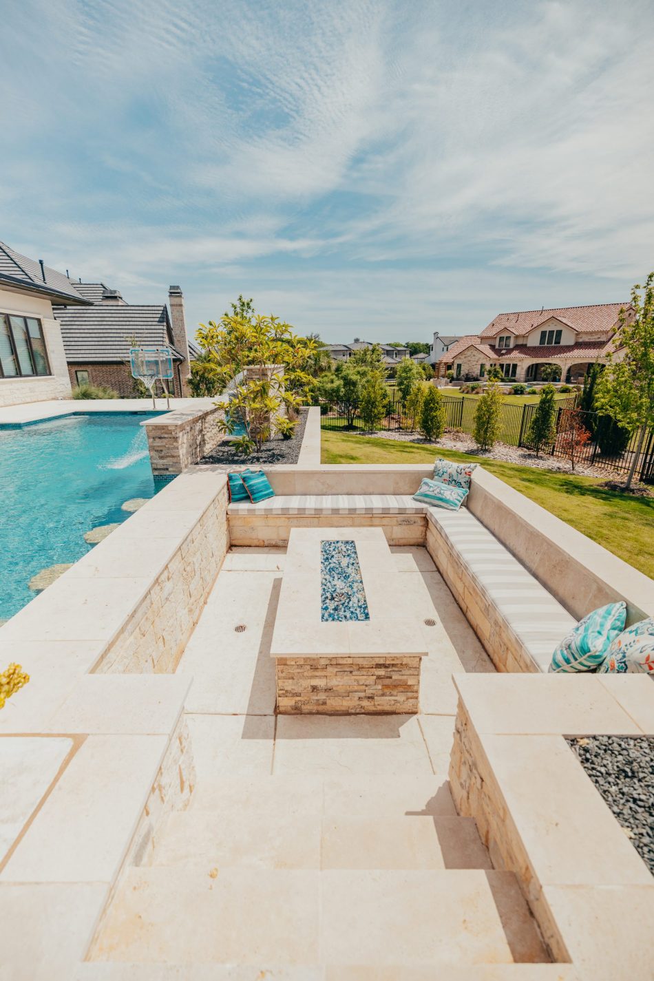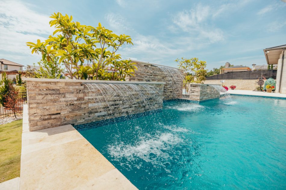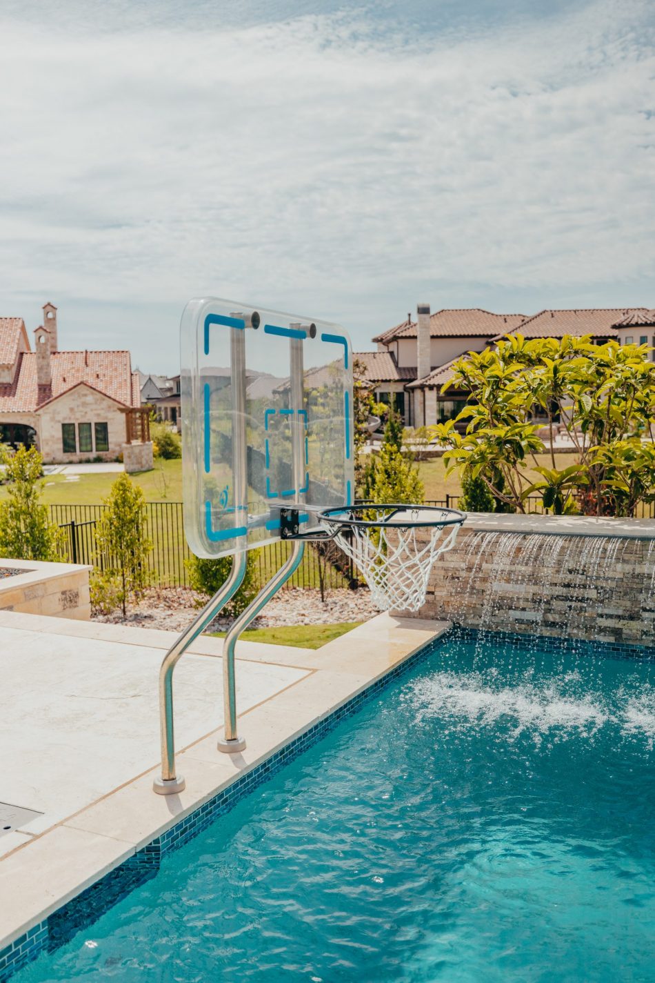- Features: Aqua Blue PebbleSheen • Basketball Hoop • Bubblers • Flush Spa • Grey Ice Heavy Stone Texture • In-Pool Bar Stools • Ivory Travertine • Linear Fire Pit • Sheer Descent Rain Walls • Tanning Ledge •