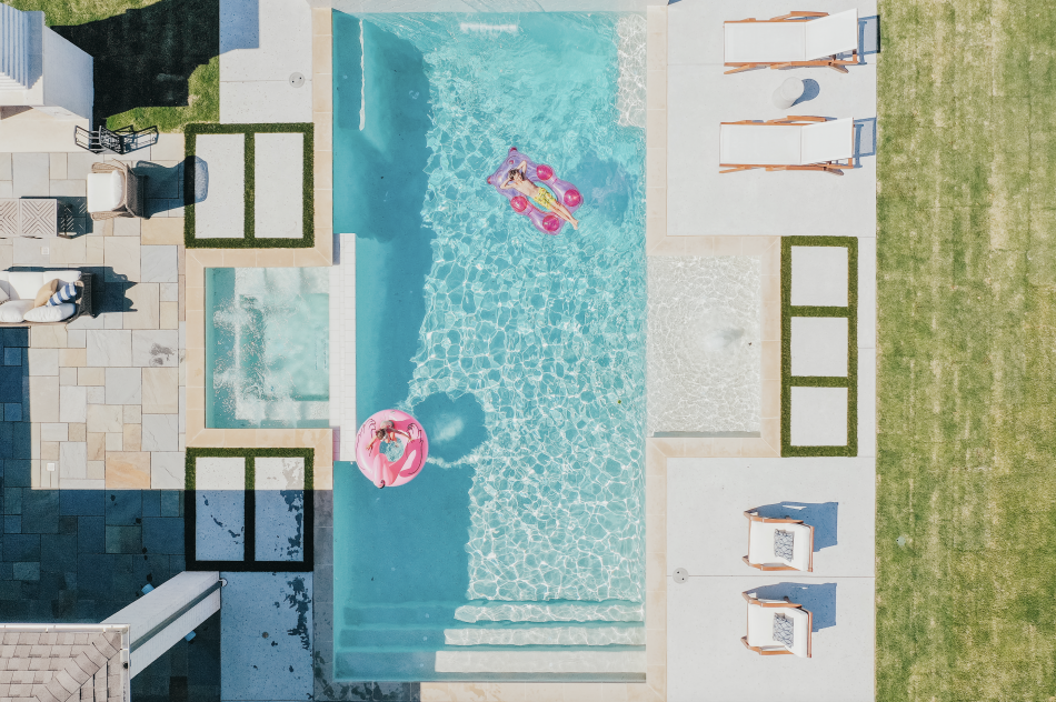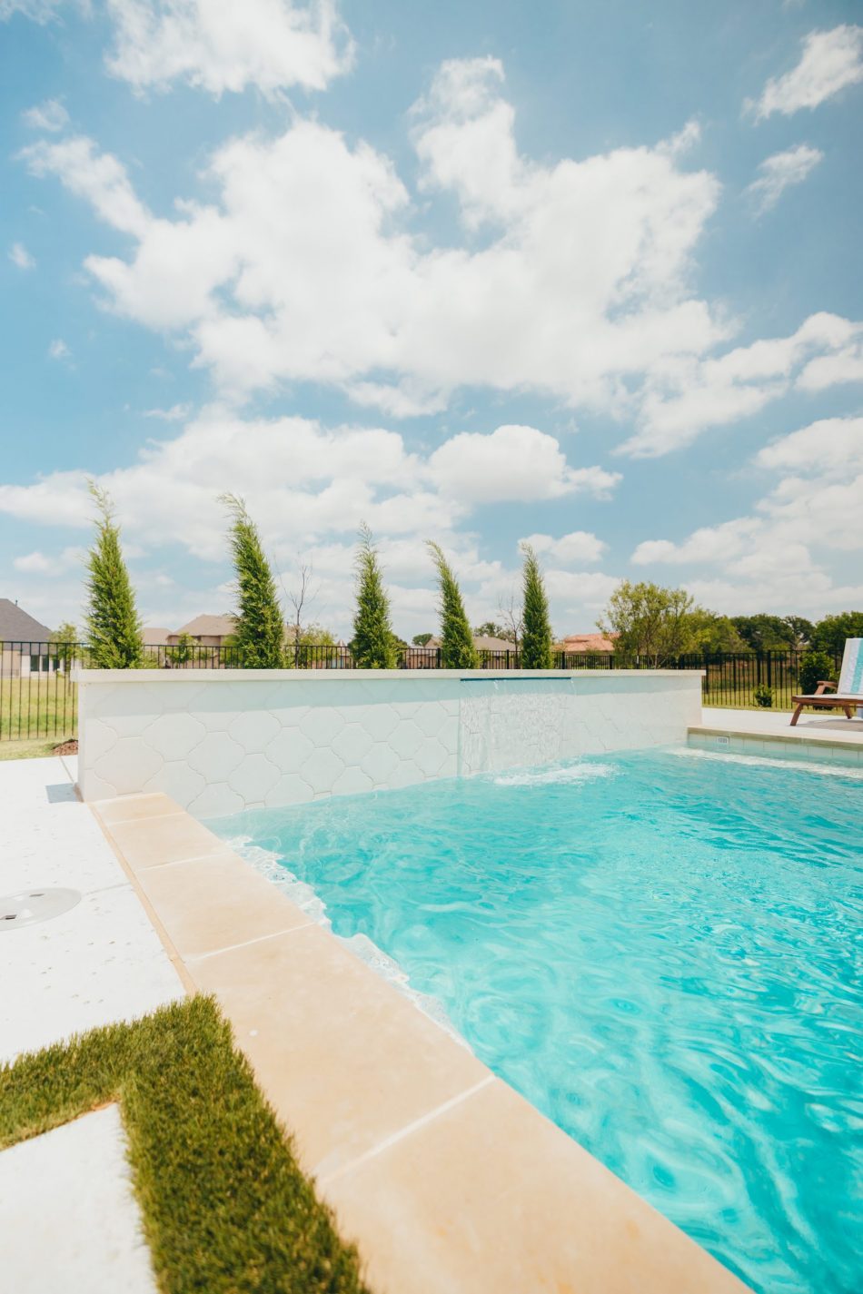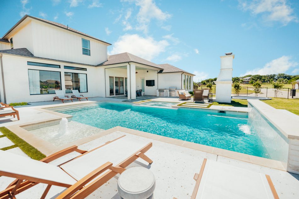 - Features: Bubblers • Buff Lueders • Fire Place • In-ground Trampoline • Outdoor Bathroom • Outdoor Kitchen • Raised Beam • Sheer Descent • White Diamonds PebbleSheen •