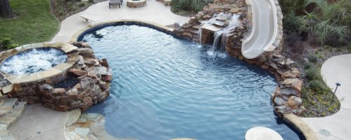 - Features: Blue Granite PebbleSeen • Bubblers • Diving Board • Fire Bar • Fire Pit • In-Pool Table • Laminar Jets • Line Burner • Moss Rock Boulders • Oklahoma Flagstone • Slide • Tanning Ledge • Turf • Waterfall •