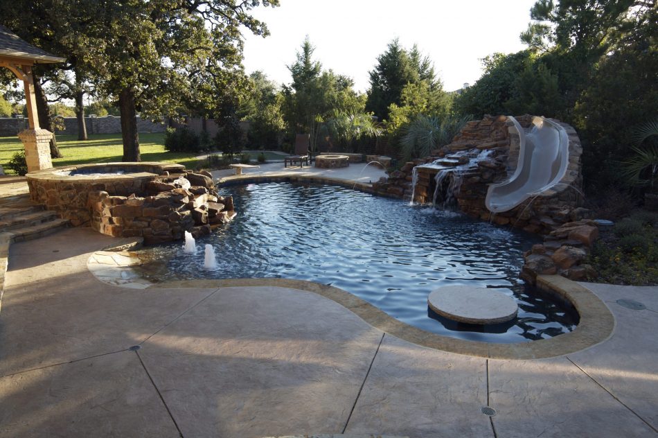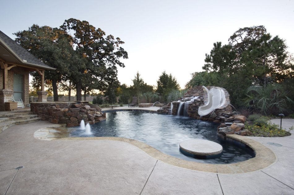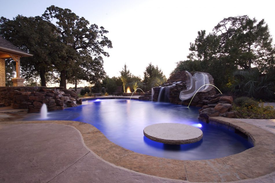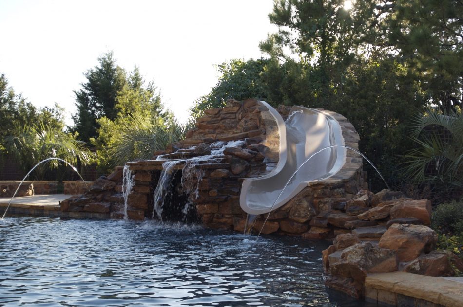 - Features: Blue Granite PebbleSeen • Bubblers • Diving Board • Fire Bar • Fire Pit • In-Pool Table • Laminar Jets • Line Burner • Moss Rock Boulders • Oklahoma Flagstone • Slide • Tanning Ledge • Turf • Waterfall •