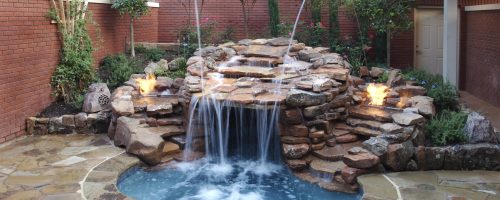 - Features: Arbor • Cave • Fire Bar • Fire Pit • Grotto • Laminar Jets • Milsap Stone • Moss Rock Boulders • Ocean Blue PebbleSheen • Outdoor Kitchen • Spa • Waterfall •