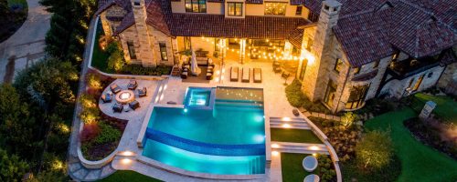 How do you transition from the house to the golf course 10 feet below? With a vanishing edge pool, of course. The large tanning ledge (3 grandkids) with lots of lighted gushers, are the first thing you see as you enter the front door and gaze across the pool onto the golf course. The spa had to be raised 18″ for easy access, near the master bedroom door and not block the view of the pool and golf course. The spa is level with the pool and dropping the patio 18″ helped transition the yard’s substantial cross slope and solved all the challenges. The 24″ drop down to the fire pit area kept the spa users warm and close to the master and helps also deal with the slope transition.. The fire pit was a great visual feature from the spa as well as a gathering spot. The house retaining wall also provided additional seating for the large family gathers for smores. An additional wall allowed for planting for privacy and accent around the fire pit. The vanishing edge basin had to be large enough for dogs and grand kids to swim around and steps the full length for the dogs safely to get out. The sweeping curved weir wall and landscape walls open the travertine paving out to the evergreen synthetic grass and flow through to the golf course. House stone was used on all the landscape walls but wanted the weir to sparkle with glass tile. When you visit you can see who won the race of the sculptures, the tortoise or the hare and enjoy the views too.