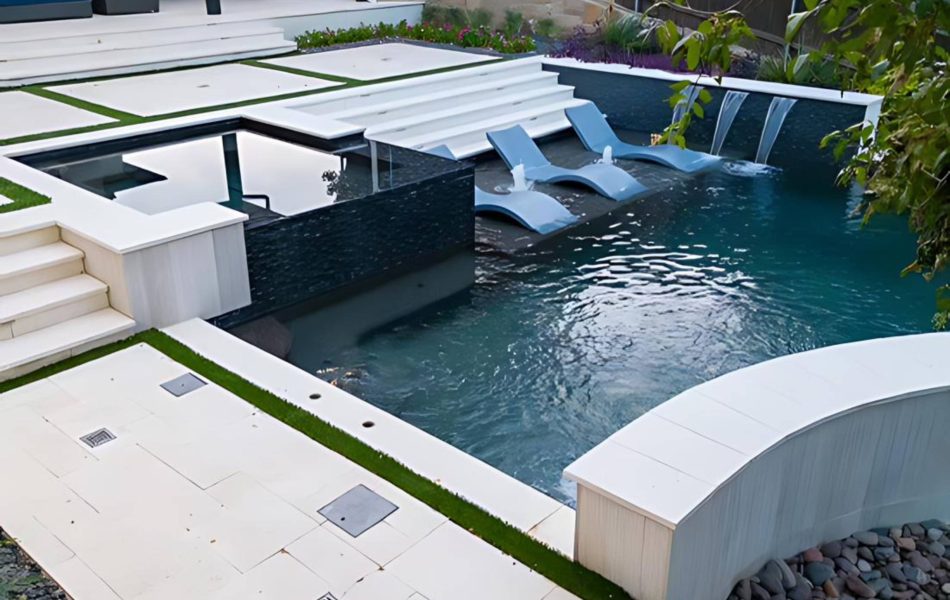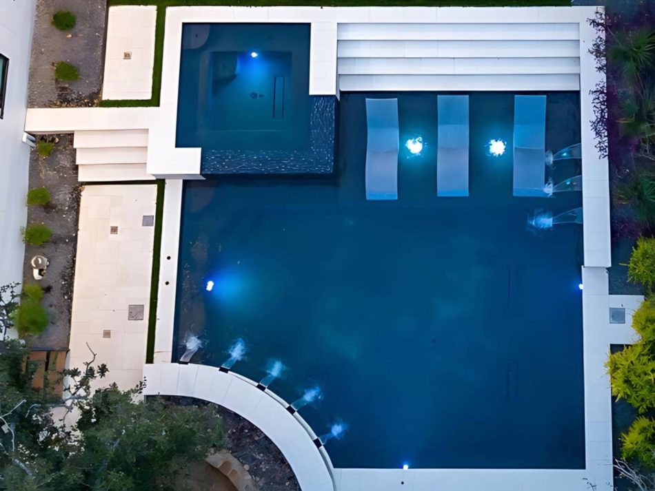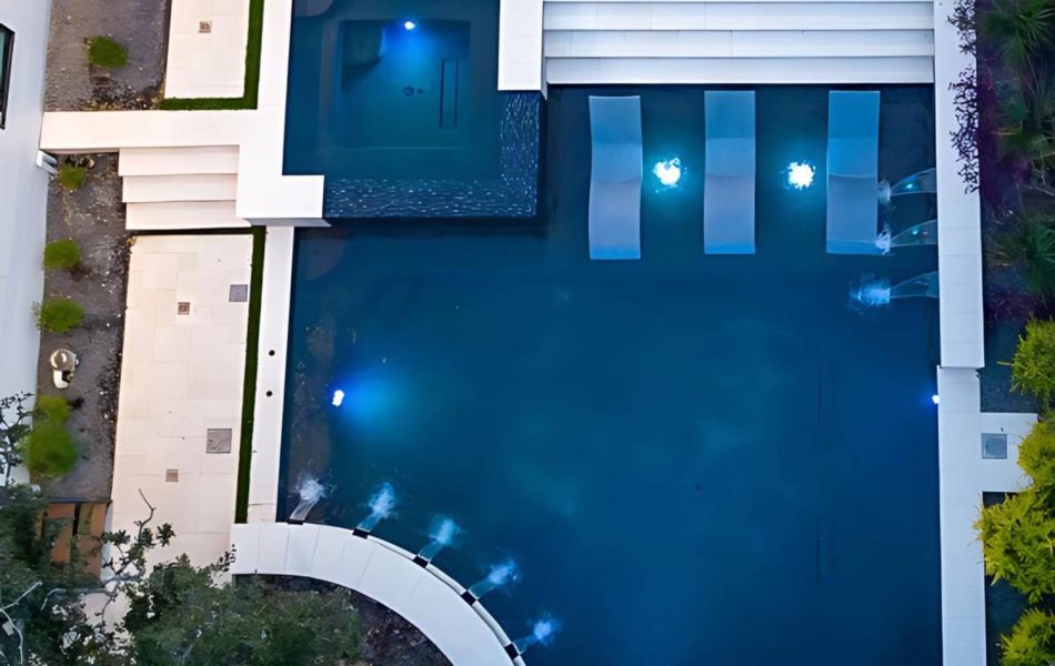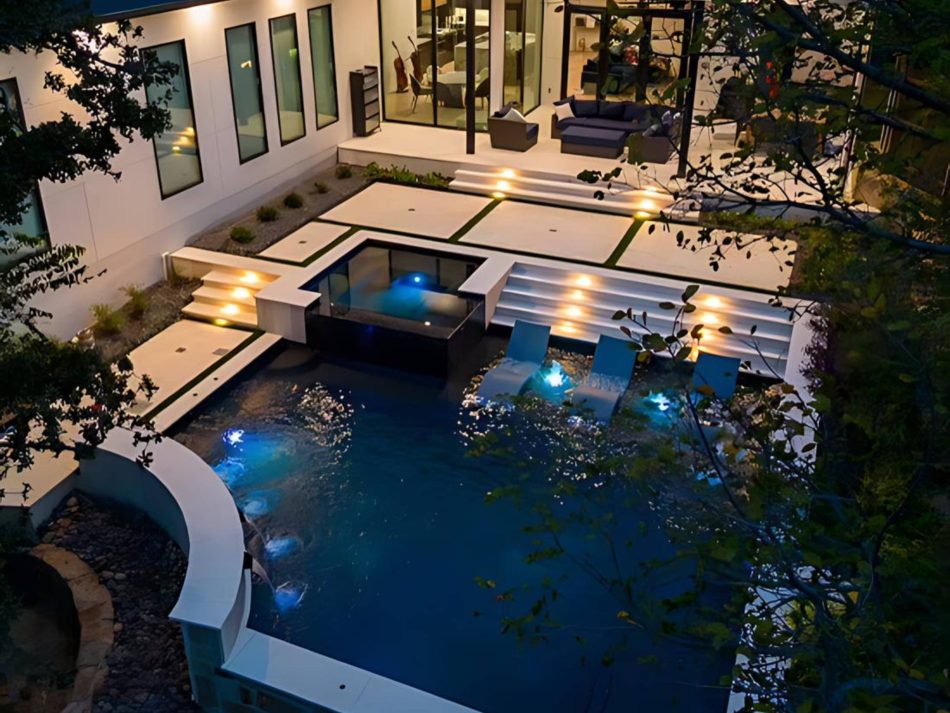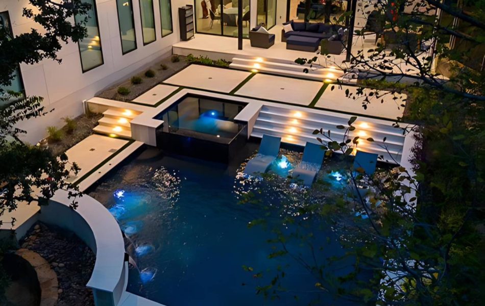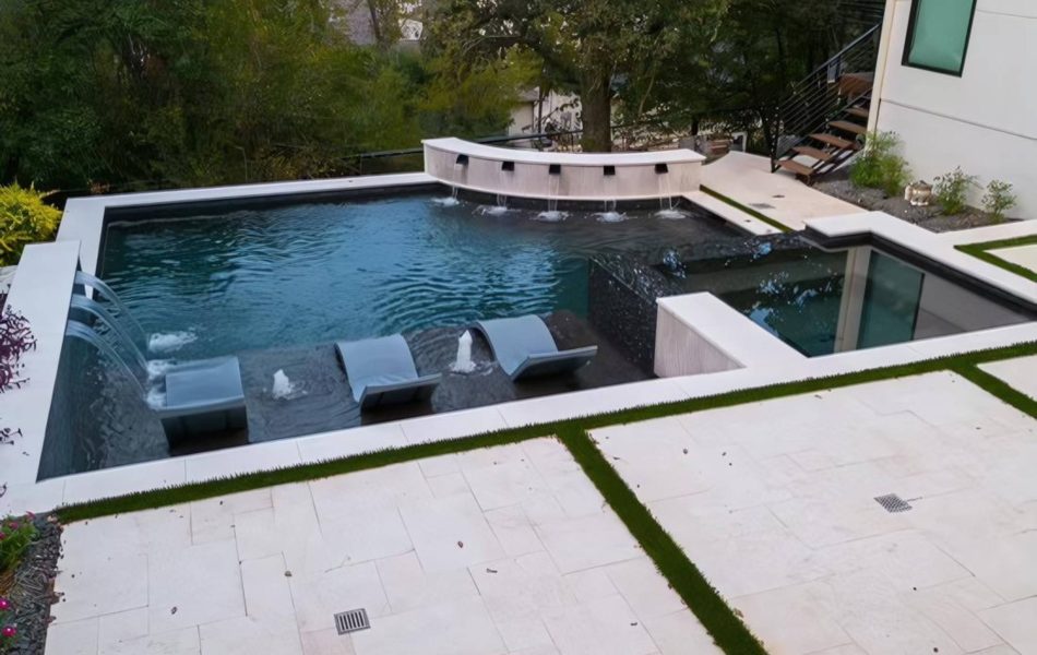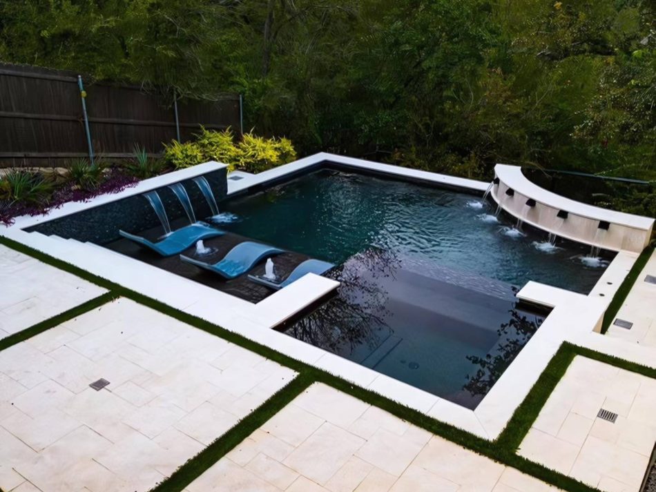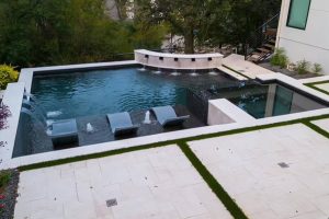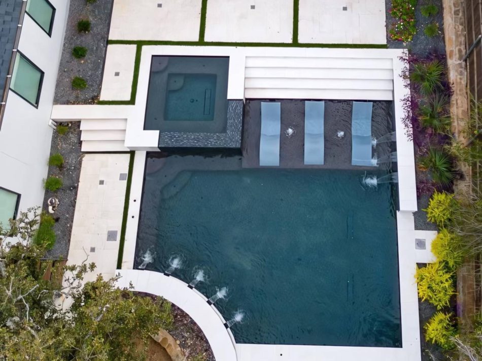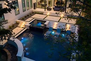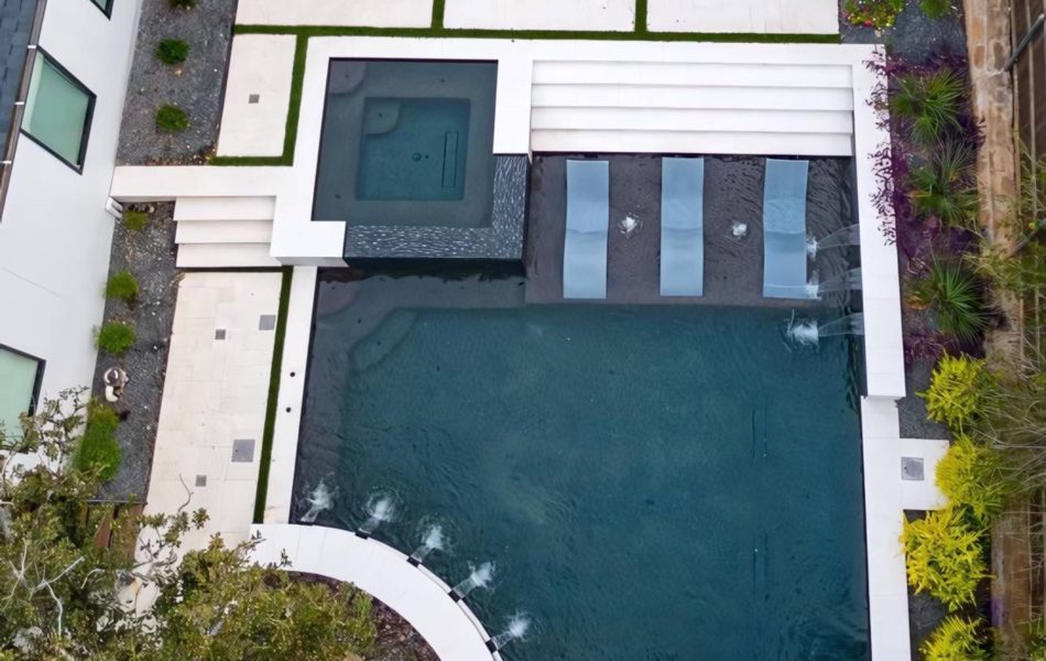 This custom modern project was a thrill to create! The client wanted a unique shape, loaded with light, water, and fire features. Along with a tanning ledge, and custom raised spa, this beautiful project is the perfect escape for this family.