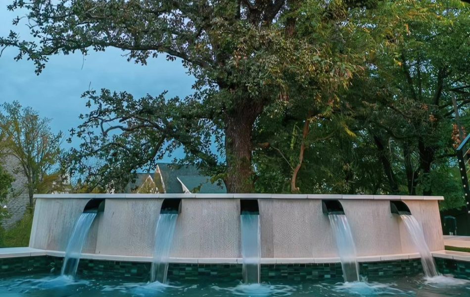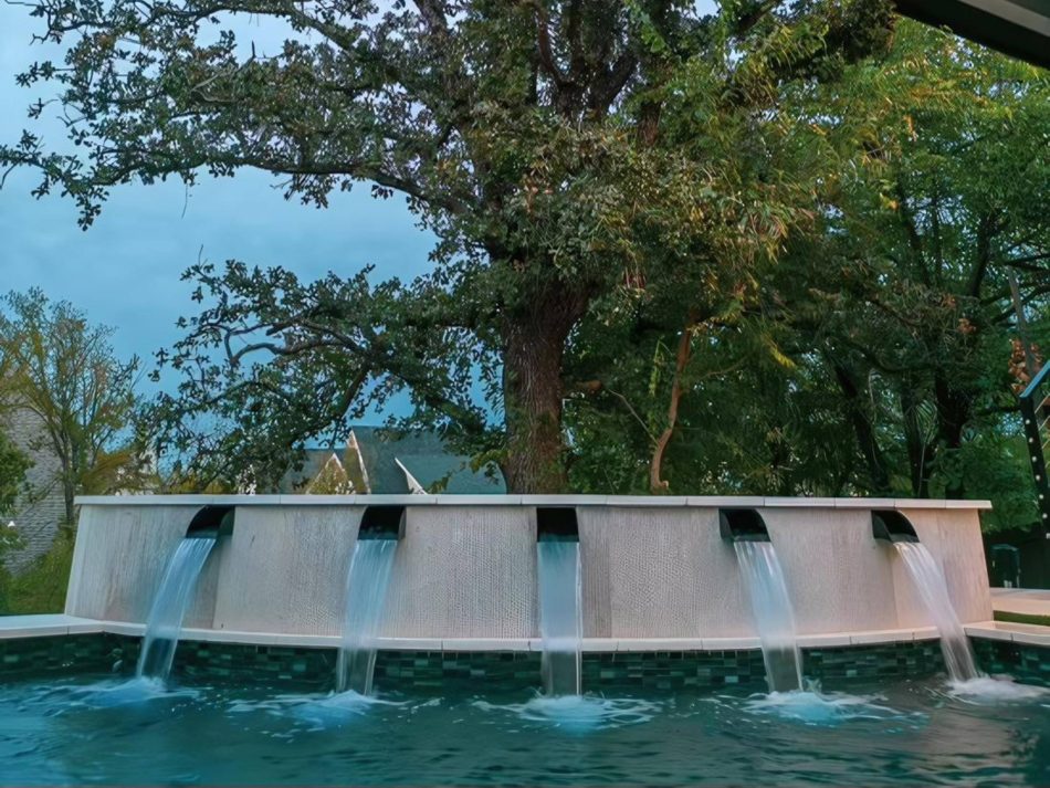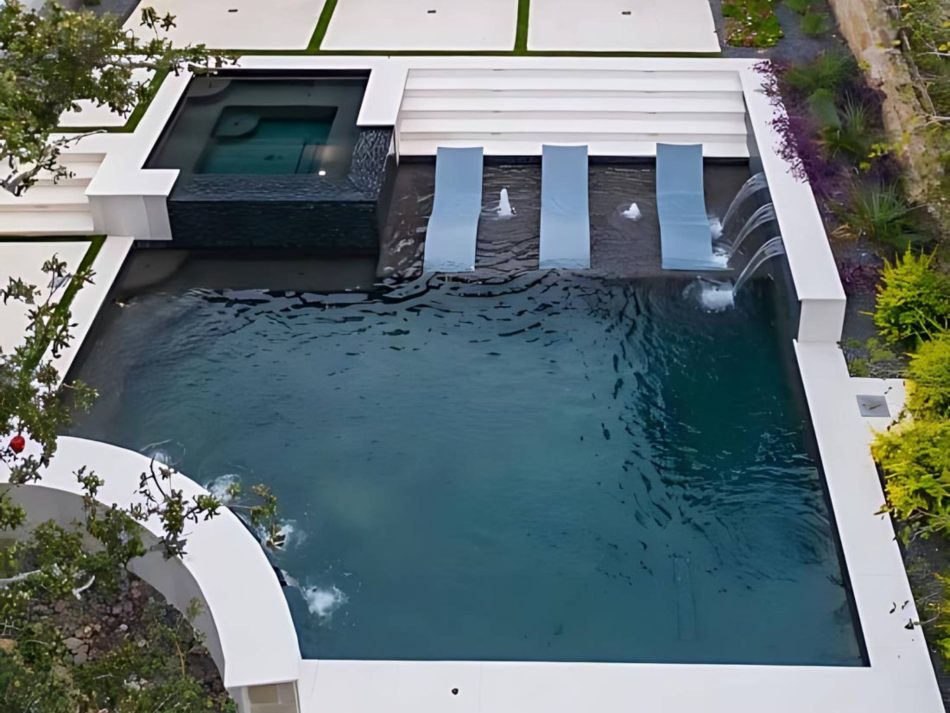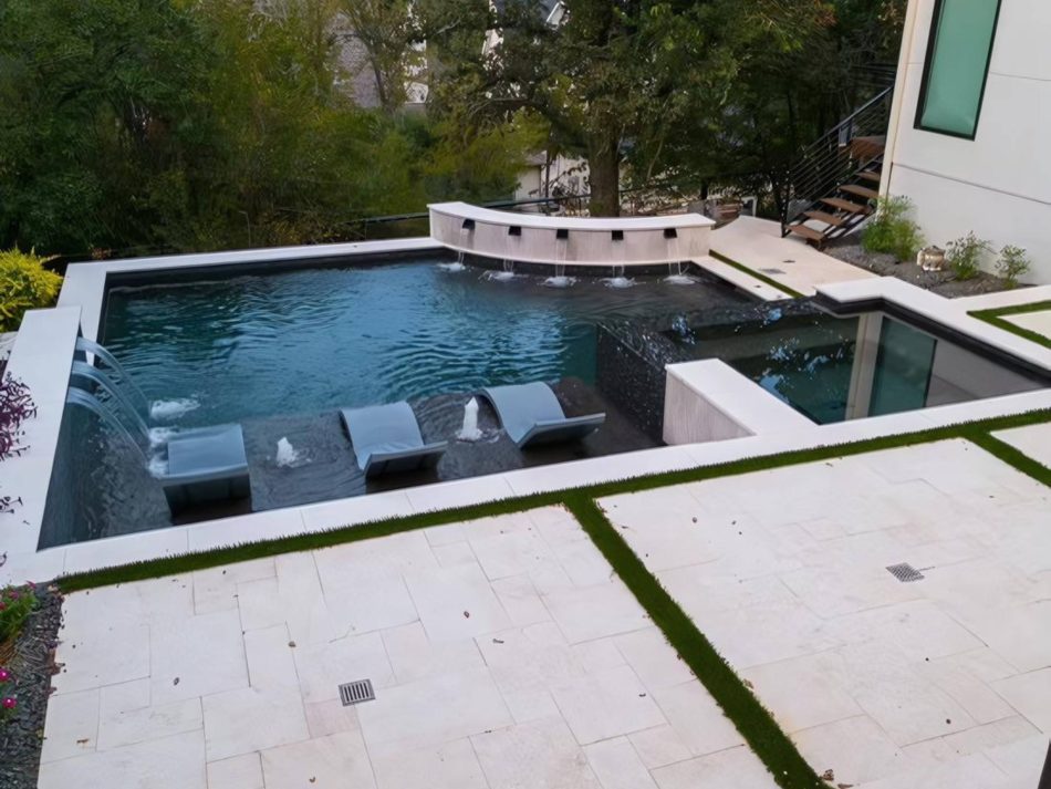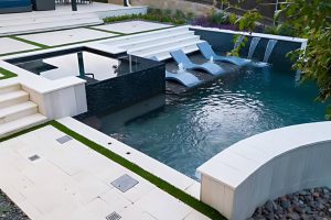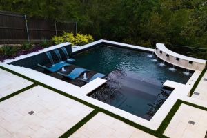 - Features: Black Onyx PebbleSheen • Bubblers • Step Lights • Tanning Ledge • Water Wall • Waterfall •