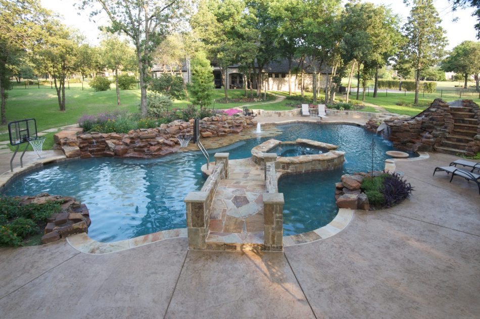 - Features: Basketball Hoop • Blue Granite PebbleSeen • Cabana • Cave • Diving Board • Fireplace • Grotto • In-Pool Table • Moss Rock Boulders • Oklahoma Flagstone • Outdoor Kitchen • Slide • Tanning Ledge •