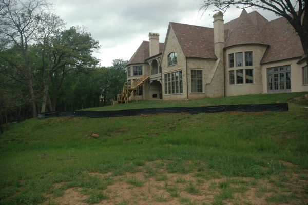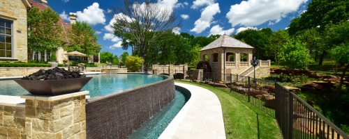 When the owner requested what he wanted, we said we could provide his dream along with the help of many engineers. The centerpiece was the pool, providing the transition from the Formal French style home to the natural surroundings. The simple curved vanishing edge wall clad in dry stack slate provided the transition. The pool was piered due to the proximity to the 30-foot cliff down to the pond. A new dam, dredging out the swamp, while diverting water from natural spring and diverting subdivision drainage filled with sediment around the pond location (around one side of the house) and three year process with the Army Corp of Engineers got the pond back. All equipment for the project was located in the lower level of the two level cabana. The water wheel provides the focal point, fit with the French style and became part of the elaborate drain system for the subdivision. The dry stream becomes a large creek with rainfall so the bridge and cabana engineering created a solution to handle everything. The basin to trap sediment before going to the pond (around other side of pond) also created water for the water wheel. Terraces from the Great Room provided seating areas for large and small gatherings where you can try to take in all of the owner’s dream and more.