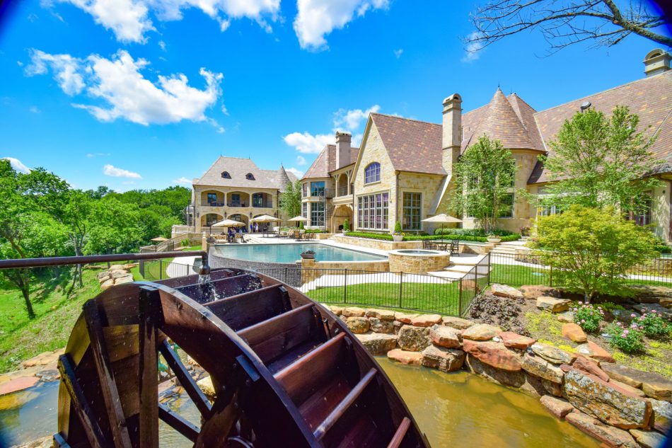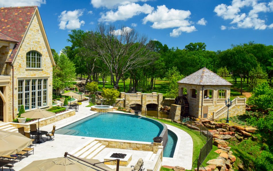 When the owner requested what he wanted, we said we could provide his dream along with the help of many engineers. The centerpiece was the pool, providing the transition from the Formal French style home to the natural surroundings. The simple curved vanishing edge wall clad in dry stack slate provided the transition. The pool was piered due to the proximity to the 30-foot cliff down to the pond. A new dam, dredging out the swamp, while diverting water from natural spring and diverting subdivision drainage filled with sediment around the pond location (around one side of the house) and three year process with the Army Corp of Engineers got the pond back. All equipment for the project was located in the lower level of the two level cabana. The water wheel provides the focal point, fit with the French style and became part of the elaborate drain system for the subdivision. The dry stream becomes a large creek with rainfall so the bridge and cabana engineering created a solution to handle everything. The basin to trap sediment before going to the pond (around other side of pond) also created water for the water wheel. Terraces from the Great Room provided seating areas for large and small gatherings where you can try to take in all of the owner’s dream and more.
