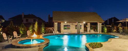 - Features: Blue Surf PebbleSheen • Drop Beam • No Color Heavy Stone Texture • Outdoor Kitchen • Silver Travertine • Smoke Lueders • TV •