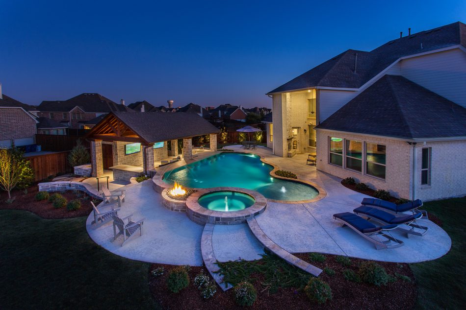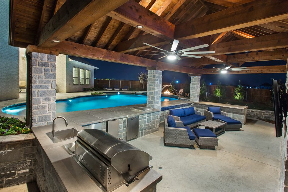 - Features: Blue Surf PebbleSheen • Drop Beam • No Color Heavy Stone Texture • Outdoor Kitchen • Silver Travertine • Smoke Lueders • TV •