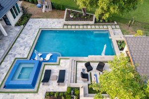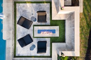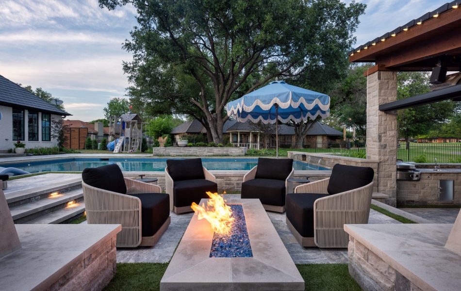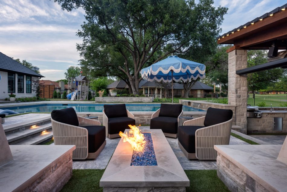 To accent the depth of the property from the 4 different lines of sight and to protect the Live Oak, the pool was run perpendicular to the house. This also allowed enough space for the fire pit, spa and cabana setbacks from the property line. The master bedroom and kitchen view the length of the pool to the sheer rain falls but still had a great view to the golf course behind. The front entry and family room line of sight looks over the reflective perimeter overflow spa; recessed fire pit with built in seating/retaining wall through the sunken cabana to the golf course. The Galley kitchen/retaining wall and the fireplace/screen wall/retaining wall allow you to walk out level to the 4′ lower grass lawn. The cabana shed roof minimized seeing a roof profile looking to the golf course and worked with the height variance required by the city. The shingles matched the home and the Grey Limestone coping/veneers blended the interior home colors to the outside. The limestone was custom cut for the swim up bar counter. The Versalle pattern Travertine work perfect with the asymetrical layout. The porch was expanded to be more functional and capped with same material. The Travertine stepping stones by the Oak allowed additional air/moisture to the tree root system. Turf accents keep a garden feel with low maintenance. There still was room for the playset out of the primary sight lines and this luxury puzzle was complete for this family.