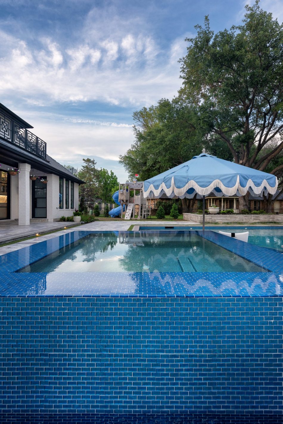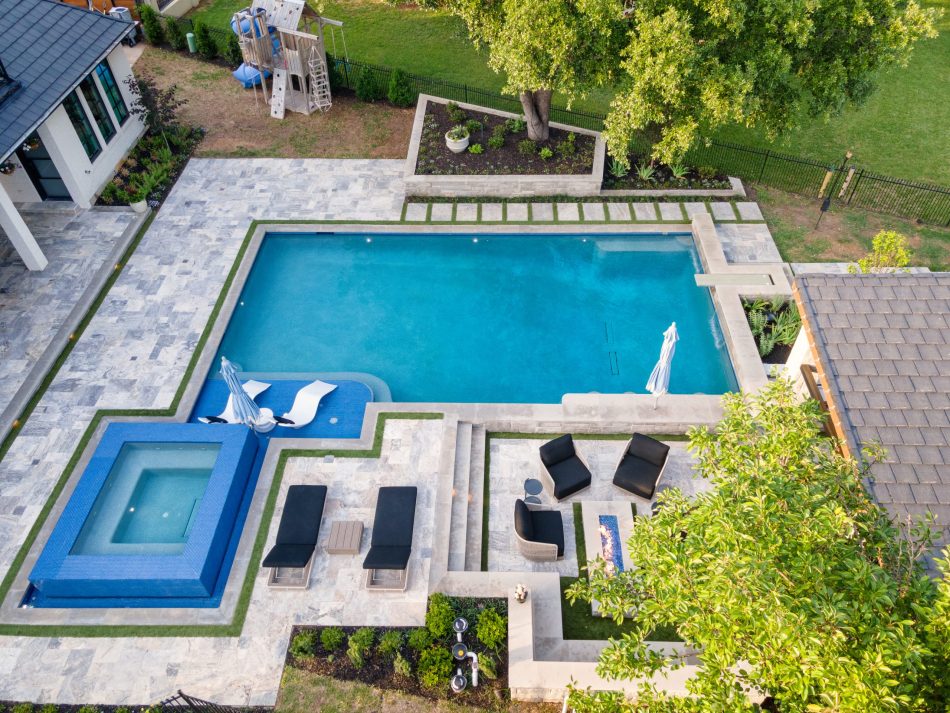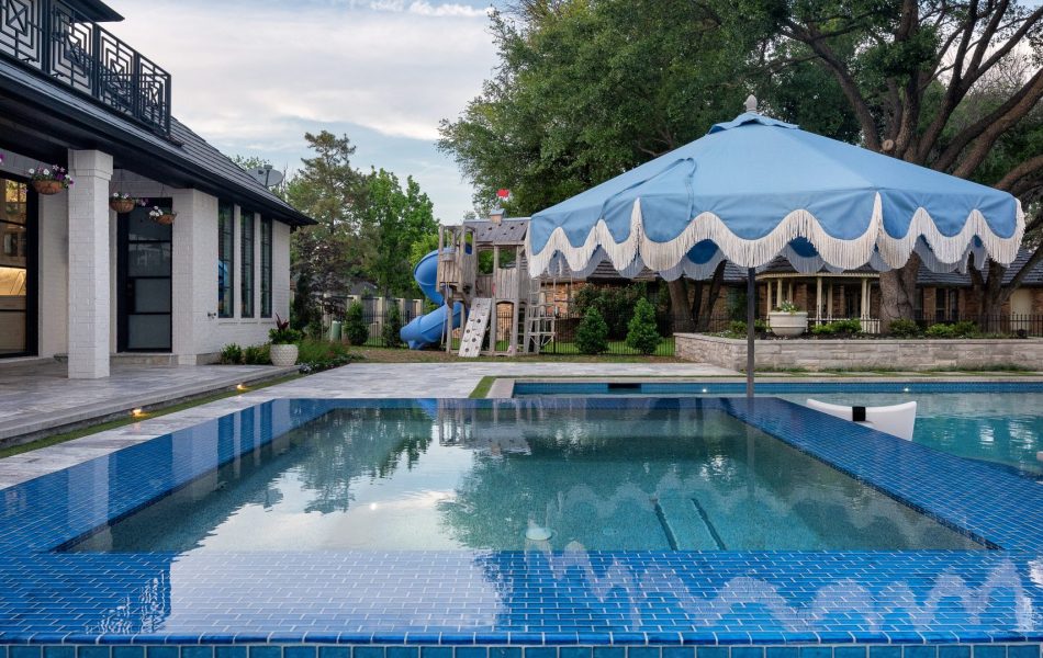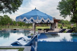 - Features: Swim-Up Bar • Blue Surf PebbleSheen • Bubblers • Fireplace • In-Pool Bar Stools • Ledge Lounger • Line Burner • Outdoor Kitchen • Rain Sheer Descent • Raised Spa • Shed Roof Cabana • Silver Travertine • Smoke Lueders • Tanning Ledge •