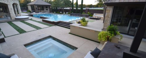 Unique= artificial turf, acrylic pool walls; LED lighted gushers, tile with miter cuts, fast lane, stainless steel, floating fire bowls, rolled perimeter overflow water feature and pool into LED lighted channel with underground vault, contemporary coach lights, water wall/ bar with textured tile, TED runway lights at elevation changes, cantilevered concrete coping on spa added to large diving pool, separate spa, outdoor kitchen, new cabana and incorporate existing cabana.