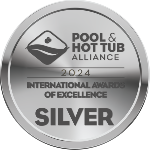 The pool’s unique, modern shape was carefully designed to preserve an existing oak tree and fit seamlessly into the compact space. Light-colored limestone and tile were chosen to match the home’s stucco, while black pool finishes echoed the house’s accents. Water feature walls were strategically placed to manage the property’s grade and create focal points for views from both the family room and master bedroom. A finger ledge on the raised back wall provides safety and a convenient spot to rest a drink, while the reflective spa, flush with the middle terrace, offers uninterrupted views. To enhance accessibility, part of the lower wall was removed to add steps to the lowest level, which also facilitated plumbing connections. Finally, turf was added to the terraced patios to introduce greenery, blending with the plantings that soften the space’s edges. The result is a visually striking and functionally unique design that fully maximizes the challenging site.