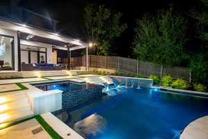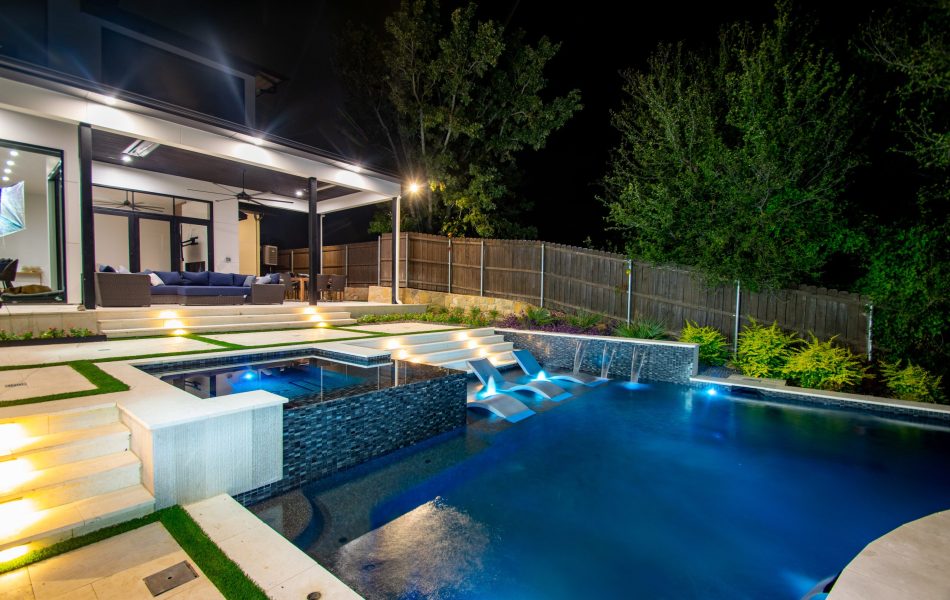 The pool’s unique, modern shape was carefully designed to preserve an existing oak tree and fit seamlessly into the compact space. Light-colored limestone and tile were chosen to match the home’s stucco, while black pool finishes echoed the house’s accents. Water feature walls were strategically placed to manage the property’s grade and create focal points for views from both the family room and master bedroom. A finger ledge on the raised back wall provides safety and a convenient spot to rest a drink, while the reflective spa, flush with the middle terrace, offers uninterrupted views. To enhance accessibility, part of the lower wall was removed to add steps to the lowest level, which also facilitated plumbing connections. Finally, turf was added to the terraced patios to introduce greenery, blending with the plantings that soften the space’s edges. The result is a visually striking and functionally unique design that fully maximizes the challenging site.