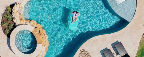 - Features: Aqua Blue PebbleSheen • Boulders • Bubblers • Ledge Lounger • Raised Spa • Tanning Ledge • Waterfall •