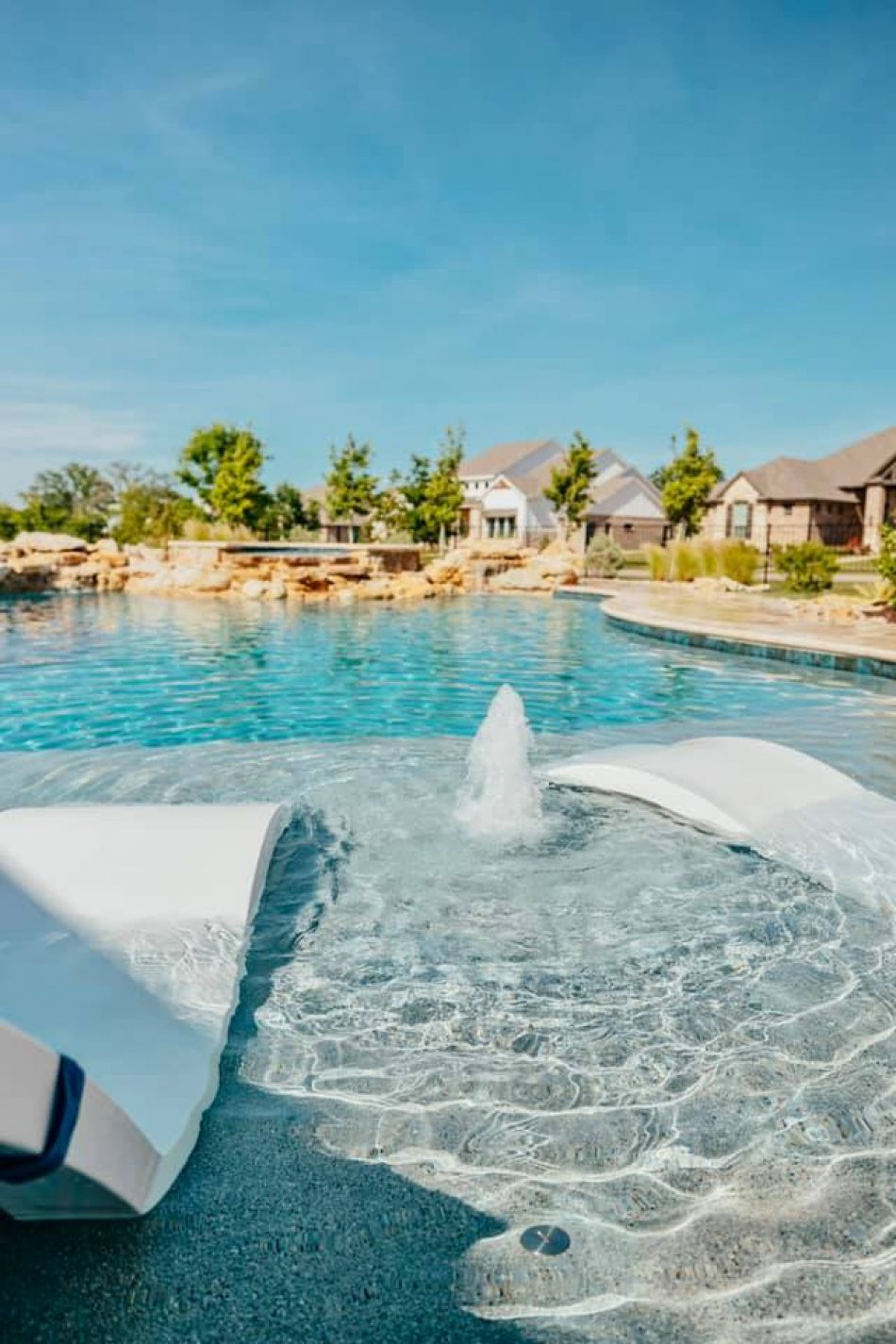 - Features: Aqua Blue PebbleSheen • Boulders • Bubblers • Ledge Lounger • Raised Spa • Tanning Ledge • Waterfall •