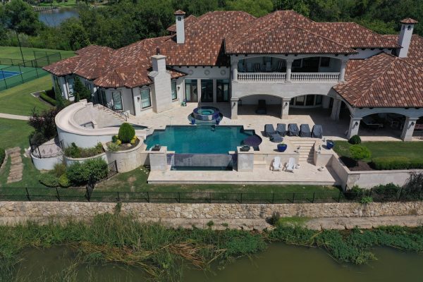 This large Infinity edge pool overlooking a lake is perfection! The customer wanted volleyball and basketball capabilities as well as diving, so the pool was designed to accommodate all the fun. The client wanted their over-sized hot tub to be a focal point out their living room doors and it turned out beautifully! Before our masterpiece could be achieved, an entire pool, negative edge, spa, huge slide structure, and decking had to be demo and removed so we could start with a clean slate. This project was overall designed to create a seamless transition from the home out to the pool area. Products, colors, and landscape were planned together to make it seem as if the pool was planned to be there the entire time!