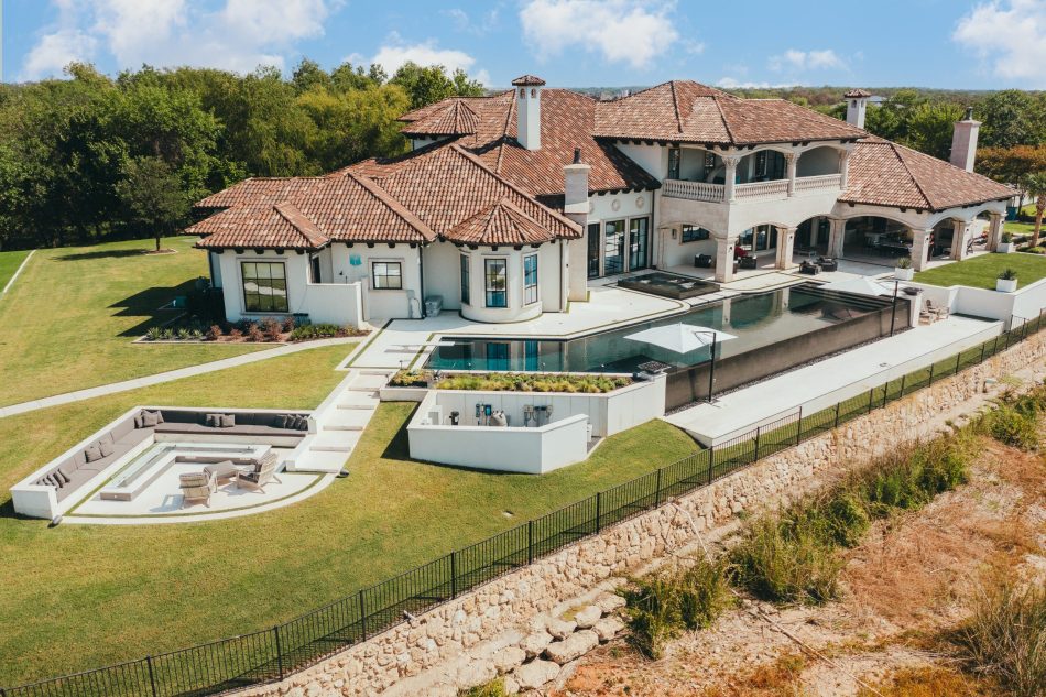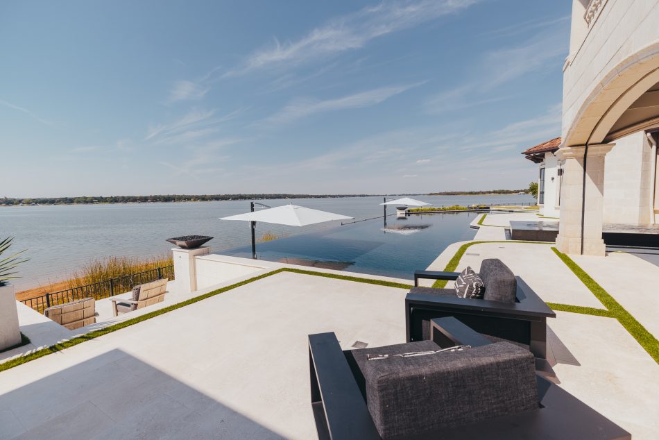 This large Infinity edge pool overlooking a lake is perfection! The customer wanted volleyball and basketball capabilities as well as diving, so the pool was designed to accommodate all the fun. The client wanted their over-sized hot tub to be a focal point out their living room doors and it turned out beautifully! Before our masterpiece could be achieved, an entire pool, negative edge, spa, huge slide structure, and decking had to be demo and removed so we could start with a clean slate. This project was overall designed to create a seamless transition from the home out to the pool area. Products, colors, and landscape were planned together to make it seem as if the pool was planned to be there the entire time!