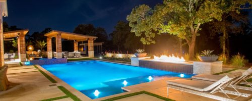 Lightness verses darkness theme carries through this project including never used materials and details to create this transitional gem. The axis and cross axis have stunning water and fire feature elements in the asymmetrical design. To open views to the yard from the family room, the existing outdoor kitchen was removed. The black precise stacked slate spillway provides sound and visual effect and contrasted with the fire line burner visible from everywhere inside. This draws you out to enjoy the pool, and a lot more. The pool offered great places to hang out with the tanning ledge and built in bar stools and lots of room for the game of volleyball. The cross axis from the master bedroom draws the eye across the pool, through the black all tile vanishing edge spa, splitting the dual cabanas, through the fire pit, to gaze on the “Dark Planet” sculpture. The poured in place colored concrete planters wrap around the fire pit and provide plants and landscape lighting to accent the space. Lighting through the Epay wood and travertine cabana columns provide additional glow at night to frame the “Dark Planet” starburst light. The cabanas were divided into entertainment and dining. The graphite air slate, from Spain, covered the entertainment floating center and the cooking counter. The counter was capped in Danae Natural Dekton and the 10′ custom floating table was wrapped in Sirius Solid Dekton. Ivory Travertine in a stack bond pattern accented the cabanas, porch, fire pit and key areas blending with the coping and some veneers. The cabana steel roof matched the front home entry roof and helps unify the existing home, with the additions. Details were important down to the lighted and tiled vanishing edge channel for the spa. This project is one to be enjoyed any day of the week but it really is the shiny star every night.