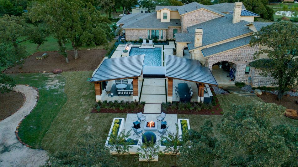 Lightness verses darkness theme carries through this project including never used materials and details to create this transitional gem. The axis and cross axis have stunning water and fire feature elements in the asymmetrical design. To open views to the yard from the family room, the existing outdoor kitchen was removed. The black precise stacked slate spillway provides sound and visual effect and contrasted with the fire line burner visible from everywhere inside. This draws you out to enjoy the pool, and a lot more. The pool offered great places to hang out with the tanning ledge and built in bar stools and lots of room for the game of volleyball. The cross axis from the master bedroom draws the eye across the pool, through the black all tile vanishing edge spa, splitting the dual cabanas, through the fire pit, to gaze on the “Dark Planet” sculpture. The poured in place colored concrete planters wrap around the fire pit and provide plants and landscape lighting to accent the space. Lighting through the Epay wood and travertine cabana columns provide additional glow at night to frame the “Dark Planet” starburst light. The cabanas were divided into entertainment and dining. The graphite air slate, from Spain, covered the entertainment floating center and the cooking counter. The counter was capped in Danae Natural Dekton and the 10′ custom floating table was wrapped in Sirius Solid Dekton. Ivory Travertine in a stack bond pattern accented the cabanas, porch, fire pit and key areas blending with the coping and some veneers. The cabana steel roof matched the front home entry roof and helps unify the existing home, with the additions. Details were important down to the lighted and tiled vanishing edge channel for the spa. This project is one to be enjoyed any day of the week but it really is the shiny star every night.
