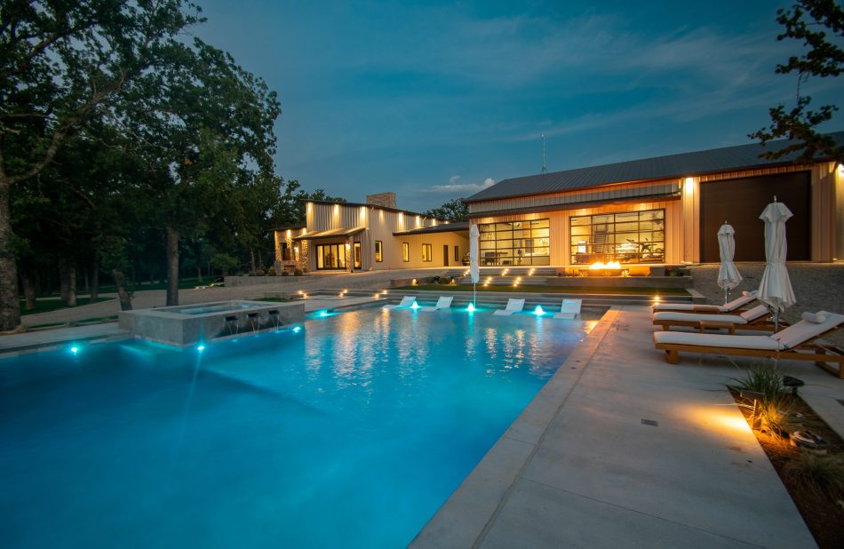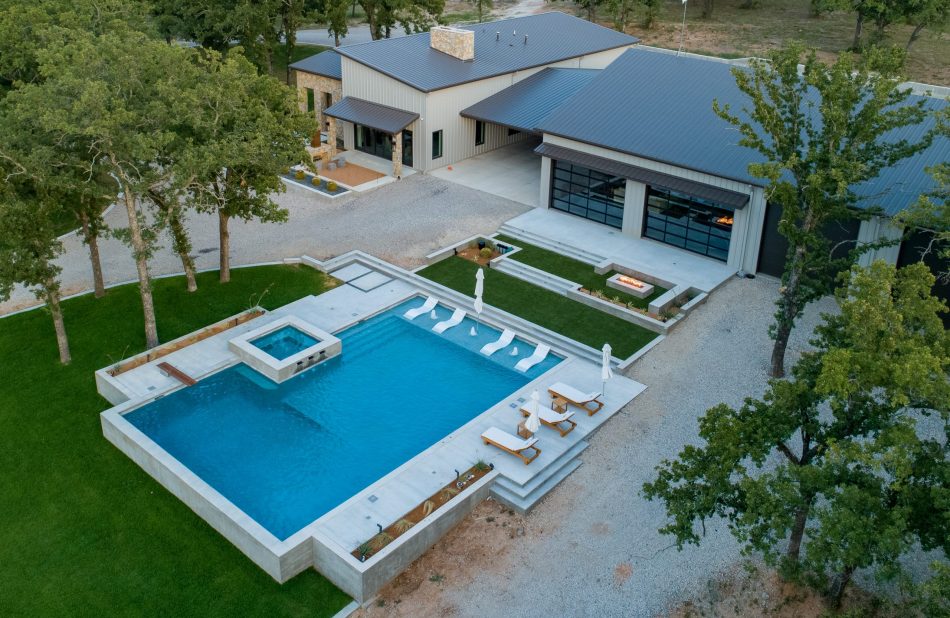 The poured in place walls, fire pit, spa, and wall veneers matched the existing walls on the site of this modern barndominium. Terraced into the hillside between the two driveways and centered on the view from inside this pool creates great zones for activity and relaxation.