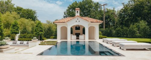 This modern mediterranean backyard is sleek with its white travertine up against the black interior pool finish. The tile was carefully selected to match the interior to give a seamless look to this stunning perimeter overflow pool with negative edge. When delivering the custom fiberglass underground tank, the truck couldn’t make it down the street with all of the many construction vehicles parked along the street, along with the tight space. The giant truck had to hold up traffic on a main busy road in the heart of Dallas and my project manager had to walk along side of this giant tank as it was hoisted up and swung from side to side making its way down the road. The impatience of nearby drivers increased to the point that one woman drove her vehicle full speed to pass the swinging tank and her mirrors missed hitting our project manager by inches. The customer wanted a very simple elegant pool that did not distract from the architecture of the house and that flowed from the back patio as on cohesive unit onto the rear covered pool house. They wanted seating areas for gathering and that was accomplished by having an elevation change off of the back negative edge and incorporating a large seating area around the firepit.