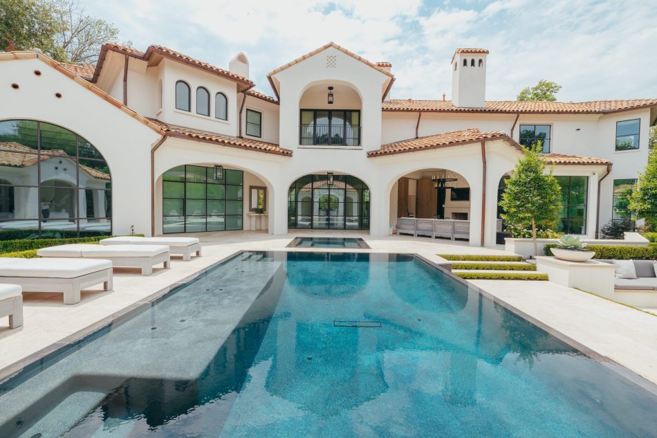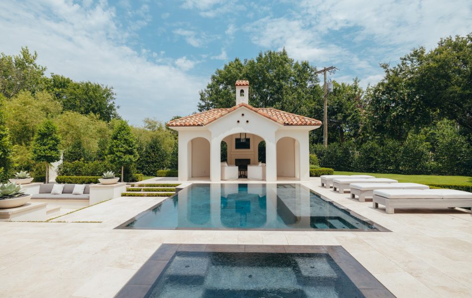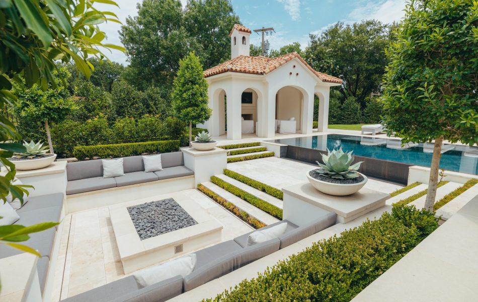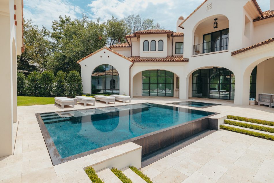 This modern mediterranean backyard is sleek with its white travertine up against the black interior pool finish. The tile was carefully selected to match the interior to give a seamless look to this stunning perimeter overflow pool with negative edge. When delivering the custom fiberglass underground tank, the truck couldn’t make it down the street with all of the many construction vehicles parked along the street, along with the tight space. The giant truck had to hold up traffic on a main busy road in the heart of Dallas and my project manager had to walk along side of this giant tank as it was hoisted up and swung from side to side making its way down the road. The impatience of nearby drivers increased to the point that one woman drove her vehicle full speed to pass the swinging tank and her mirrors missed hitting our project manager by inches. The customer wanted a very simple elegant pool that did not distract from the architecture of the house and that flowed from the back patio as on cohesive unit onto the rear covered pool house. They wanted seating areas for gathering and that was accomplished by having an elevation change off of the back negative edge and incorporating a large seating area around the firepit.