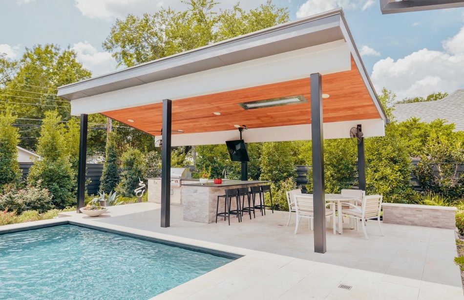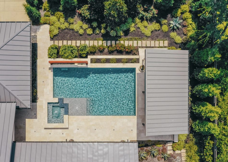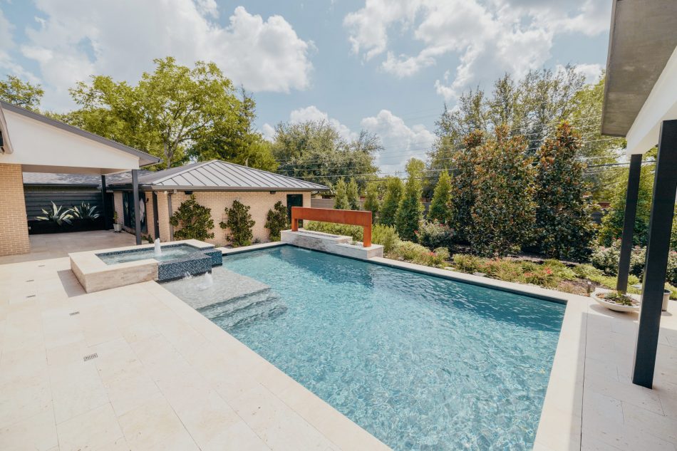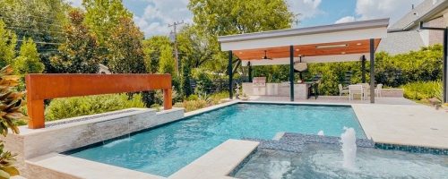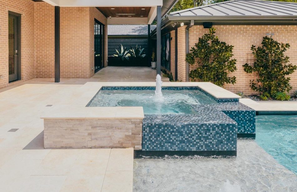 - Features: Blue Surf PebbleSheen • Grey Oak Travertine • Ivory Travertine • Outdoor Kitchen • Raised Spa • Shed Roof Cabana • Sheer Descent •