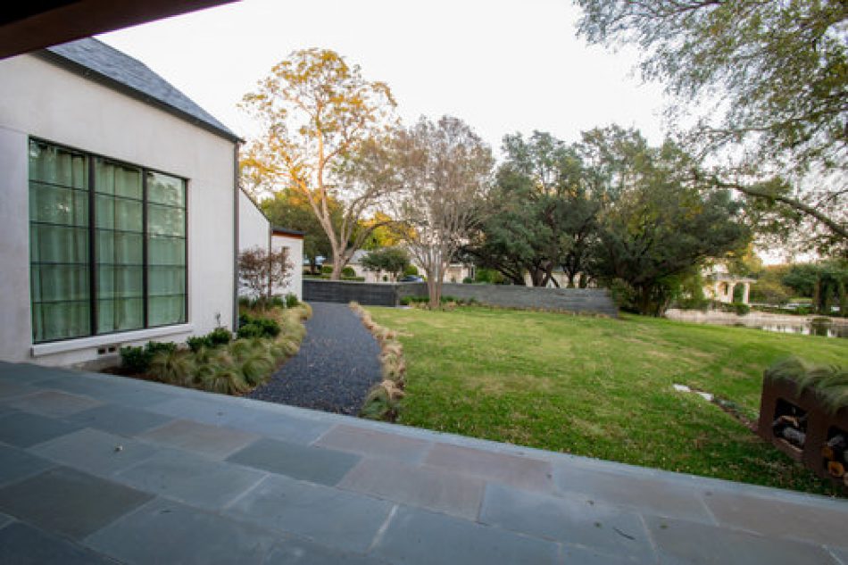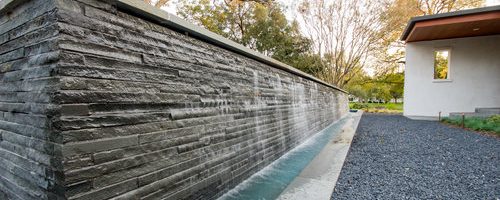 The wall creates the space between the public street and the private home, leave your stress of the world and come relax at home. The dry stack Bluestone was decided on after six sample walls were constructed. It closest matches the color of the roof and architectural lines of the home. The surprise upon entry is first the sound of water and then, the visual feature the whole walk to the front door. The stone wall extends into the tank, eliminating the tile line. The Infloor system keeps the basin cleaned. The water extended past the entry drawing you into the space facing the lake. The wall height was kept constant even as the ground sloped towards the lake. This height screened cars, from the court, when you were sitting on the patio. Large tree’s root systems determined where the wall turns occurred and still give maximum feel of the backyard. The private space with the constant trickle of water provides the perfect place of peace.
