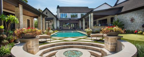 - Features: Aqua Blue PebbleSheen • Garden • Putting Green • Raised Spa • Sunken Fire Pit • Tanning Ledge •