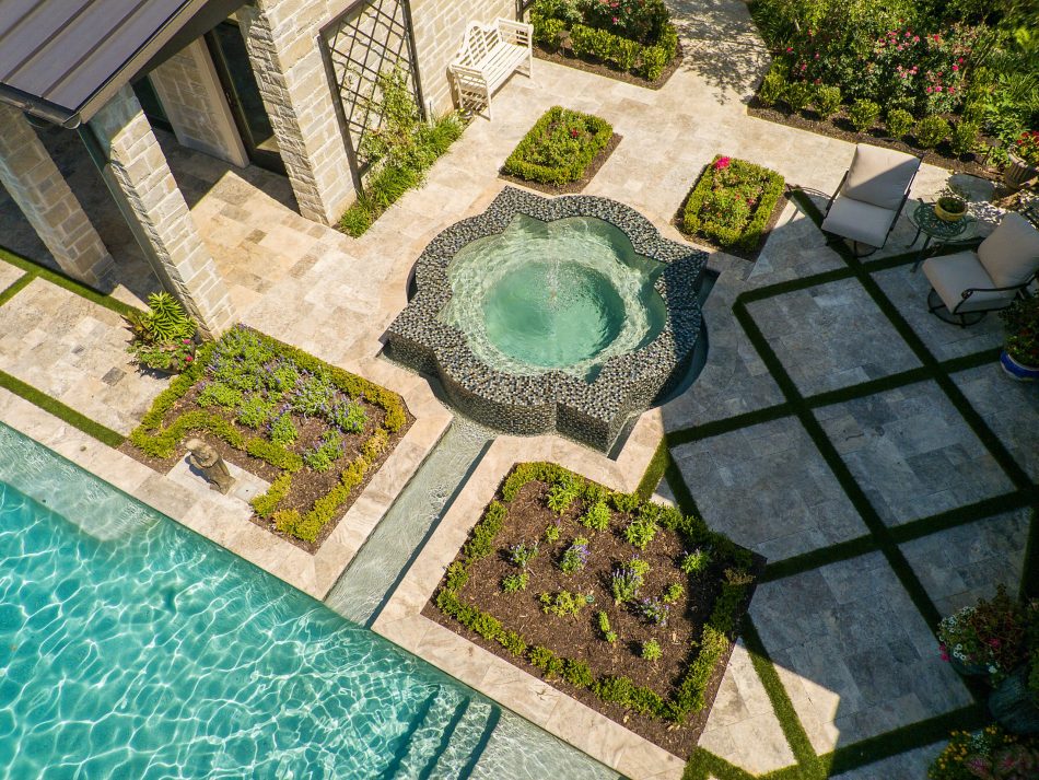 - Features: Aqua Blue PebbleSheen • Garden • Putting Green • Raised Spa • Sunken Fire Pit • Tanning Ledge •