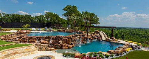 - Features: Fire Pit • Oklahoma Flagstone • One Color Heavy Stone Texture • Slide • Spa • Turf • Turtle Bay PebbleSheen • Waterfall •