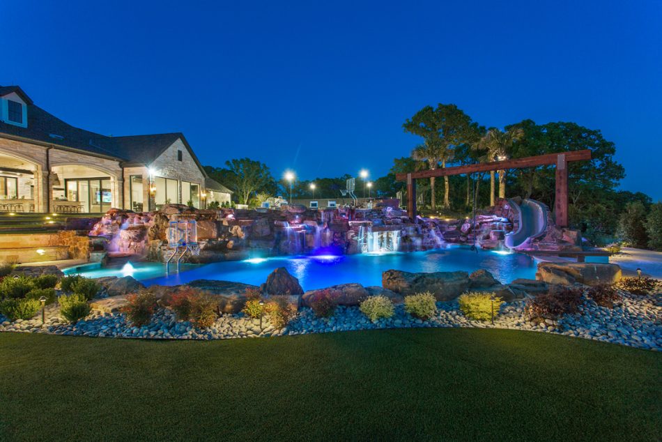 This unique project consisted of a 20 acre plot of land that the homeowner had tried to purchase for several years. When I got out to the site, I immediately understood why as it was one of the best views I had ever seen in our area and also even faced the setting sun. After understanding the clients needs of a resort style getaway in their backyard that would forever be a spot for their large gatherings and entertaining of both friends and children, the only challenge was going to be the sharp elevation change. The separated master retreat hot tub looks over the infinity edge pool with a river that is visible from the living area of the home and hidden below site is the kids resort consisting of a rope swing, wooden diving board, and a water slide. The unique feature of this project is the amphitheater styled turf steps that walk down into the yard that allowed for us to keep the area natural feeling and not have a bunch of concrete, while also allowing for the homeowner to fully utilize their 30’ blow up movie projector that they could place on their putting green for family and friend movie nights. A funny story is that we had a camera to watch over this project so that we could create a time-lapse of the construction of this project. Undenounced to us, a very tiny leaf grew from the branch that we placed the camera on so we now have 6 months footage of about a 3” leaf. Oh well!