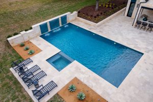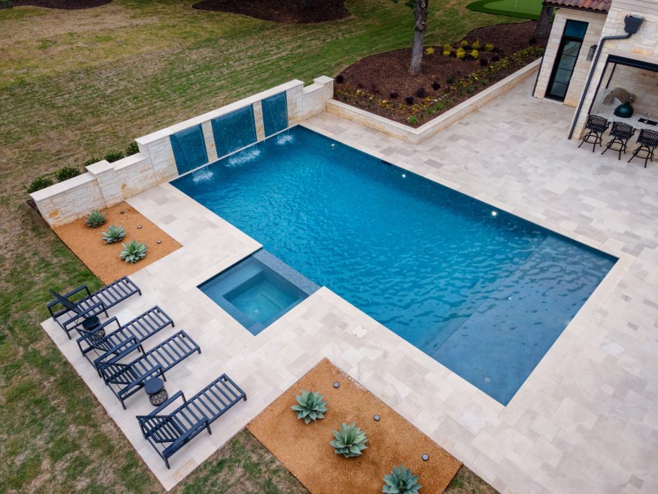 - Features: Platinum Brushed Limestone • Aquabella PebbleSheen • LED Waterfall Sheer Descent • Flush Spa • Sheer Descent • Tanning Ledge •