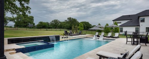 Sleek contemporary home resort featuring a tanning ledge, sheer descents, scuppers, raised spa, waterfall, and a fire pit.