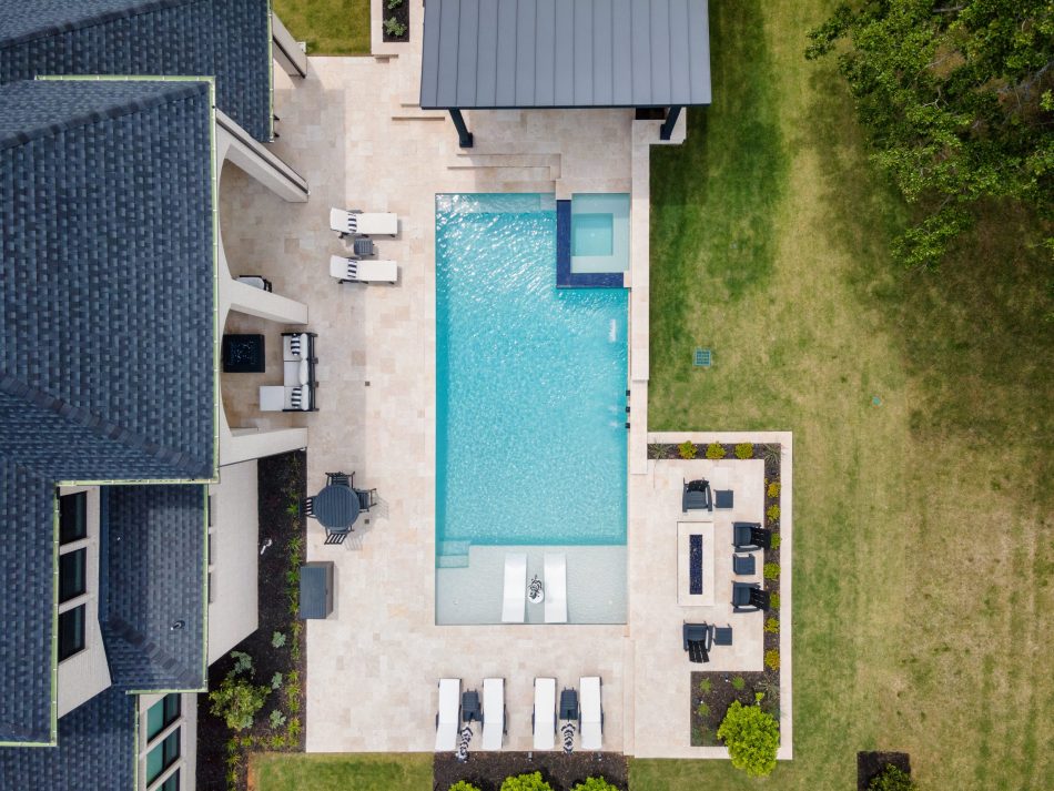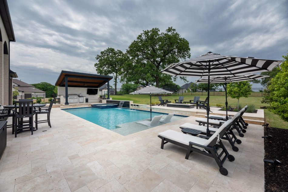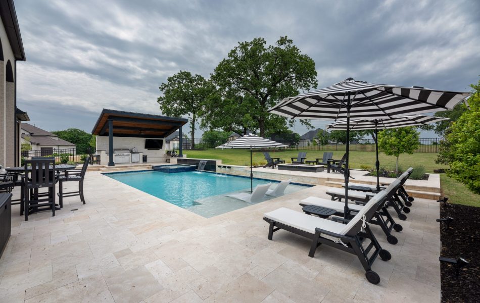 Sleek contemporary home resort featuring a tanning ledge, sheer descents, scuppers, raised spa, waterfall, and a fire pit.