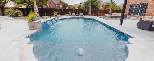 Turned a pool that was separated by grass due to drainage issues to a pool with total use of the yard. Added Firepit for sitting around with artificial turf block outs. Added Equinox arbor for shade in the new kitchen area.