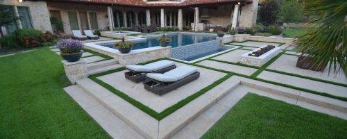 How do we put a geometric puzzle together? The clients wanted a Spanish style home and patio area. The spa was designed as a freestanding rectangular fountain and the pool was a geometric shaped recreational pool. The spa was raised six inches above the pool to allow for the spa overflow to return into the pool through underground piping. The patio elevation changes on the master side of the spa to tie in with the master patio cover elevation. Plants and grass ribbons breaks the covered tiled porch from the pool patio. Salt deck was used for the pool patio to give an aged appearance to the patio. Salt deck was used on all the steps to provide good traction and blend the materials. Grass ribbons accented the walkway space but left large patio areas intact for flexible furniture placement. A tumbled travertine was used for the coping to increase traction and gibe an aged look as well. Custom travertine pieces were used on the eighteen inch and twenty four inch coping to keep the uniform twenty four inch length. The veneers were done in stone to match the home except for the vanishing edge basin and waterline Spanish tile.