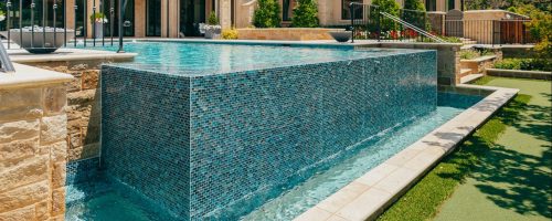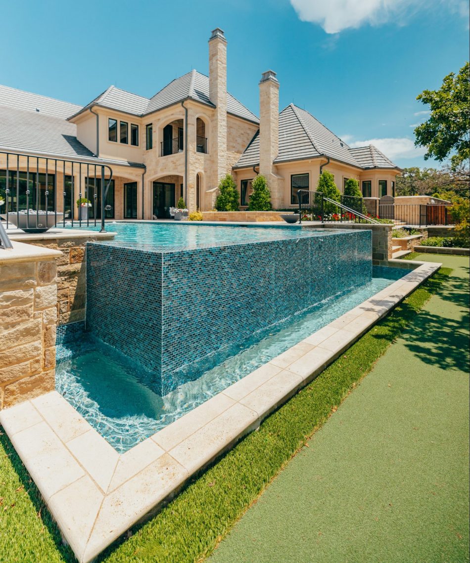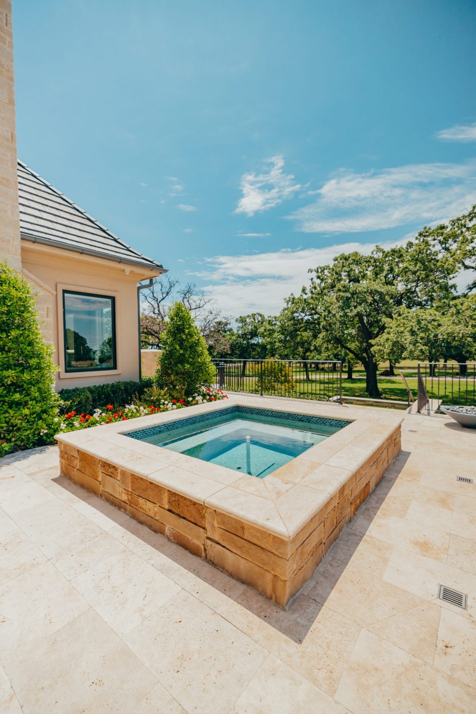 - Features: Aqua Blue PebbleSheen • Bubblers • Fire Pit • Ivory Travertine • Negative Edge • Raised Spa •