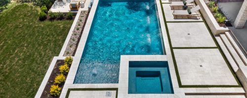 - Features: Shell Beach Limestone • Aqua Blue PebbleSheen • Bubblers • Cabana • Fire Pit • Flush Spa • Glass Tile • Rain Sheer Descent • Raised Spa • Spill Edges • Tanning Ledge •