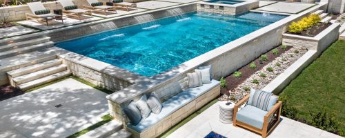 It is like a puzzle how all the pieces fit together to create spaces to entertain and live. The walls become seating, kitchen counters, bar tops and water walls terraced down the hillside so great views of every space from both inside the home to out in the garden. This also worked with the tree elevations and allowed walking to the garage and into the garden from the cabana and fire pit at the right elevation. The sheer rain waterfalls give a great visual accent and sound. The stone finger ledge allows kids to swim over and play under the water. The recent modernization of the interior spilled out into the exterior with clean lines and light colors. The front house stone was incorporated with all the veneer including removing the brick/flagstone porch column veneer and using the matching house stone. A TNG Cedar ceiling was used on the porch and continued into the pierid cabana. The cabana drop brick ledge also featured the stone veneer. The cabana roof was a Gable to allow views through to the garden from the master bedroom sitting area. Limestone decking provided a cool light surface with turf accents to bring more of a garden feel into the space.