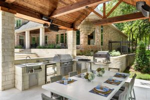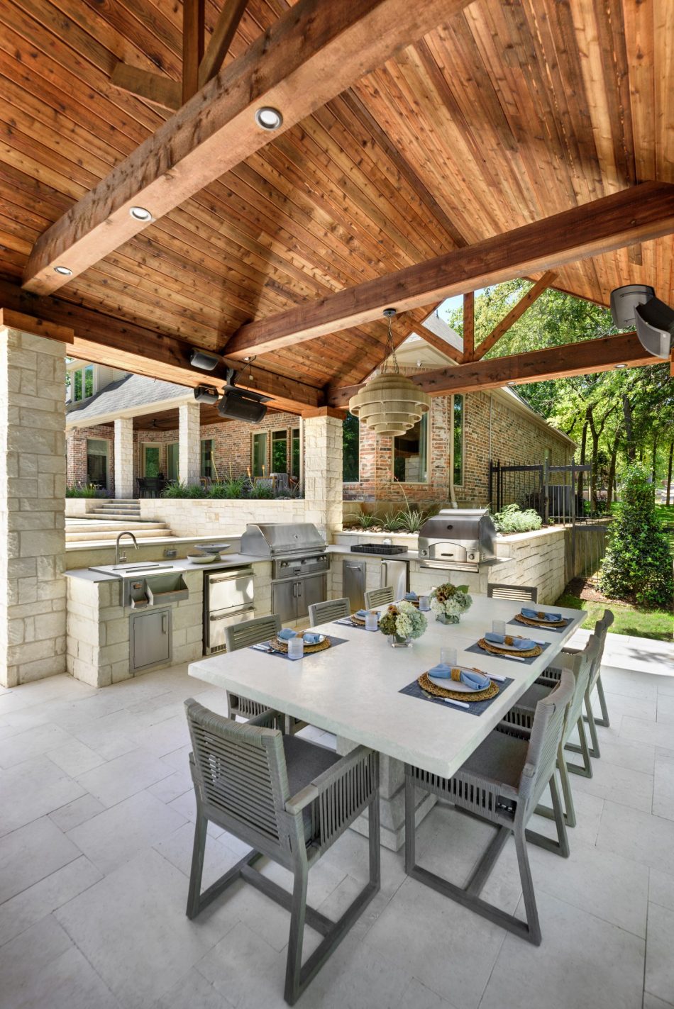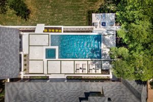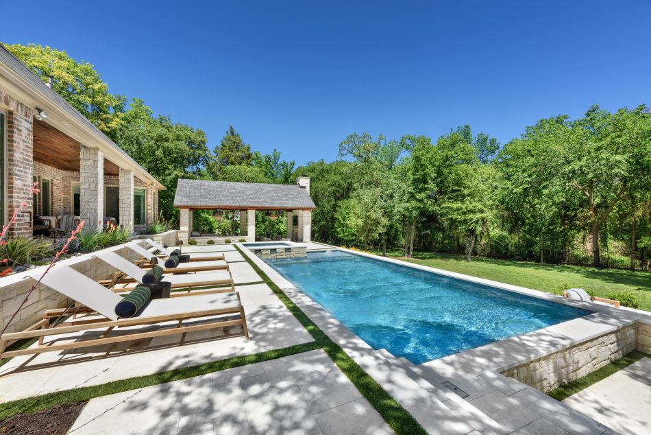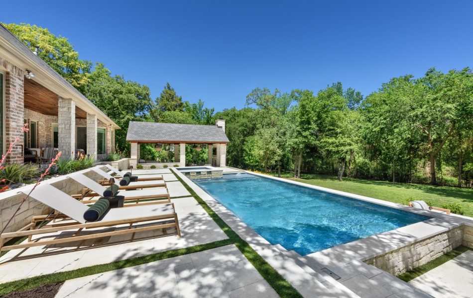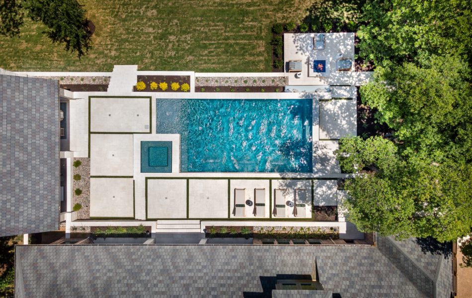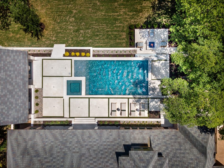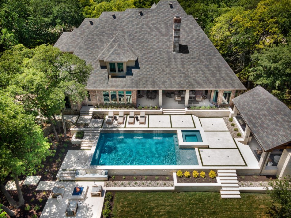 It is like a puzzle how all the pieces fit together to create spaces to entertain and live. The walls become seating, kitchen counters, bar tops and water walls terraced down the hillside so great views of every space from both inside the home to out in the garden. This also worked with the tree elevations and allowed walking to the garage and into the garden from the cabana and fire pit at the right elevation. The sheer rain waterfalls give a great visual accent and sound. The stone finger ledge allows kids to swim over and play under the water. The recent modernization of the interior spilled out into the exterior with clean lines and light colors. The front house stone was incorporated with all the veneer including removing the brick/flagstone porch column veneer and using the matching house stone. A TNG Cedar ceiling was used on the porch and continued into the pierid cabana. The cabana drop brick ledge also featured the stone veneer. The cabana roof was a Gable to allow views through to the garden from the master bedroom sitting area. Limestone decking provided a cool light surface with turf accents to bring more of a garden feel into the space.