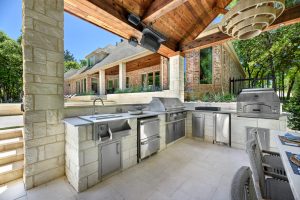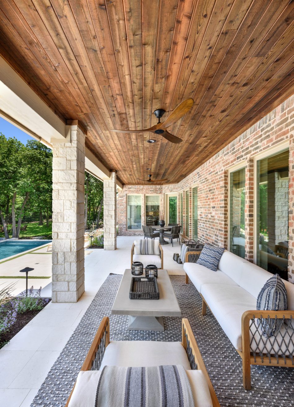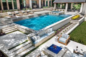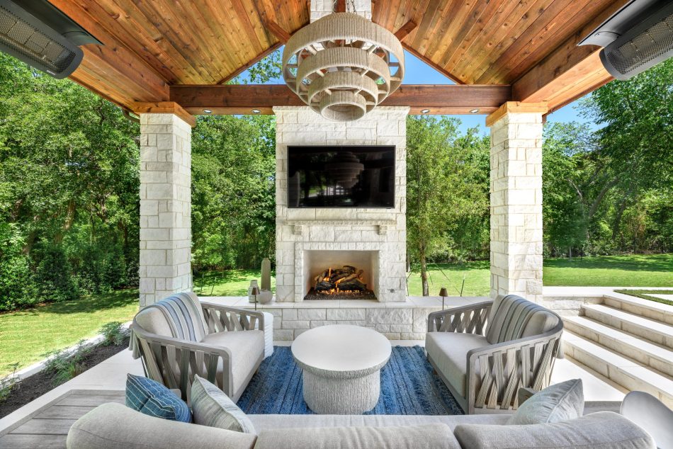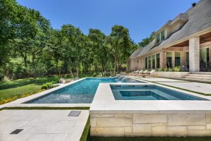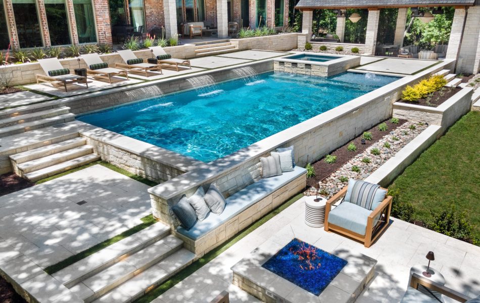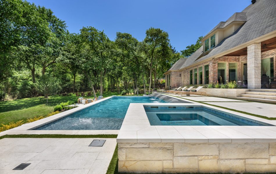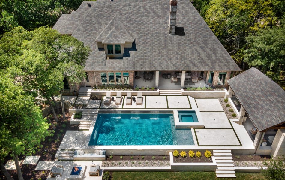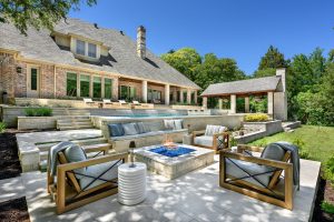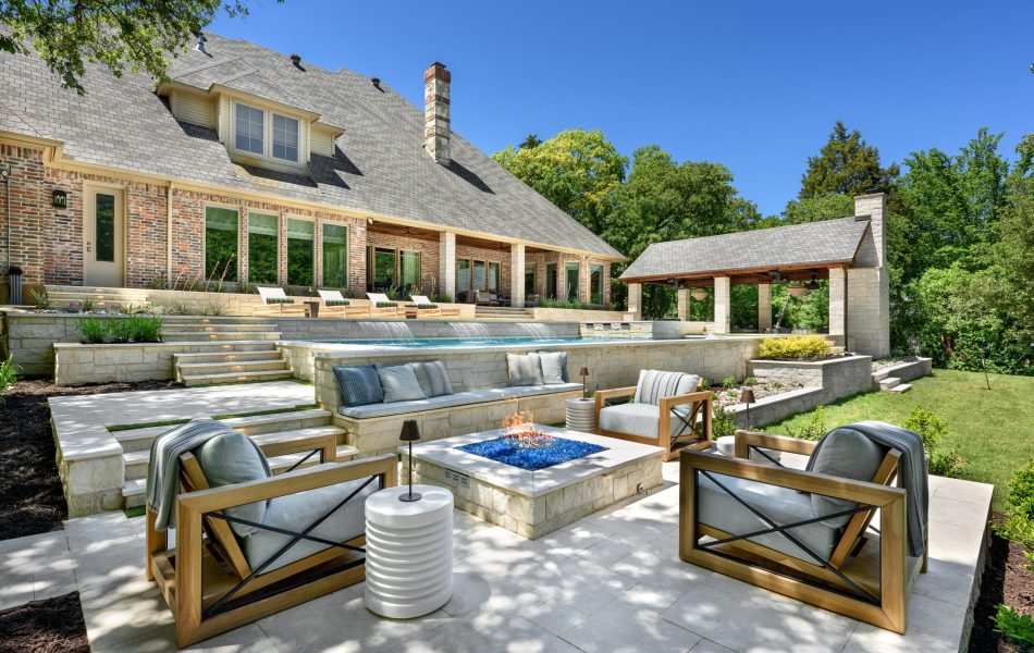 It is like a puzzle how all the pieces fit together to create spaces to entertain and live. The walls become seating, kitchen counters, bar tops and water walls terraced down the hillside so great views of every space from both inside the home to out in the garden. This also worked with the tree elevations and allowed walking to the garage and into the garden from the cabana and fire pit at the right elevation. The sheer rain waterfalls give a great visual accent and sound. The stone finger ledge allows kids to swim over and play under the water. The recent modernization of the interior spilled out into the exterior with clean lines and light colors. The front house stone was incorporated with all the veneer including removing the brick/flagstone porch column veneer and using the matching house stone. A TNG Cedar ceiling was used on the porch and continued into the piered cabana. The cabana drop brick ledge also featured the stone veneer. The cabana roof was a Gable to allow views through to the garden from the master bedroom sitting area. Limestone decking provided a cool light surface with turf accents to bring more of a garden feel into the space. Working with the interrior designer on furnishings to continue the interior style outside with furniture, chandelier, rugs and down to the cushions and pillows on the custom fire pit bench. Sitting by the fire and looking back at it all this,