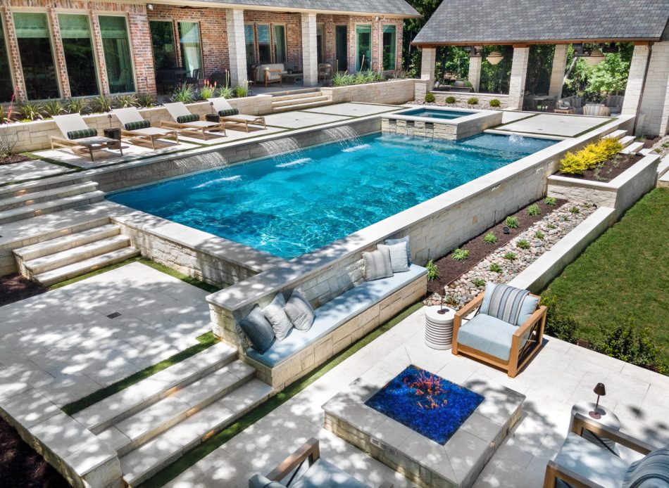 - Features: Shell Beach Limestone • Aqua Blue PebbleSheen • Bubblers • Cabana • Fire Pit • Flush Spa • Glass Tile • Rain Sheer Descent • Raised Spa • Spill Edges • Tanning Ledge •