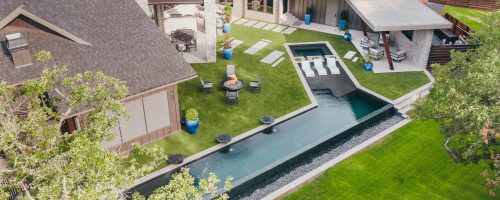 Lap pool with unique angles and long vanishing edge. Contemporary angular pool in country setting.